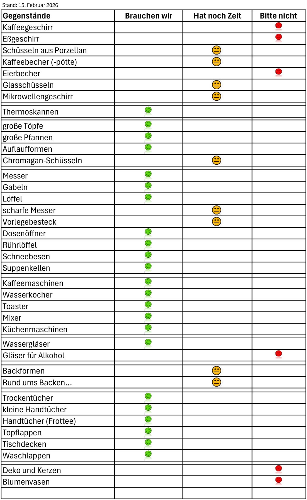 Damit Ihr uns gezielter unterstützen könnt, haben wir hier für Euch mal eine Liste zusammengestellt. Wir brauchen nicht immer alles - und wir haben nur begrenzten Lagerraum.